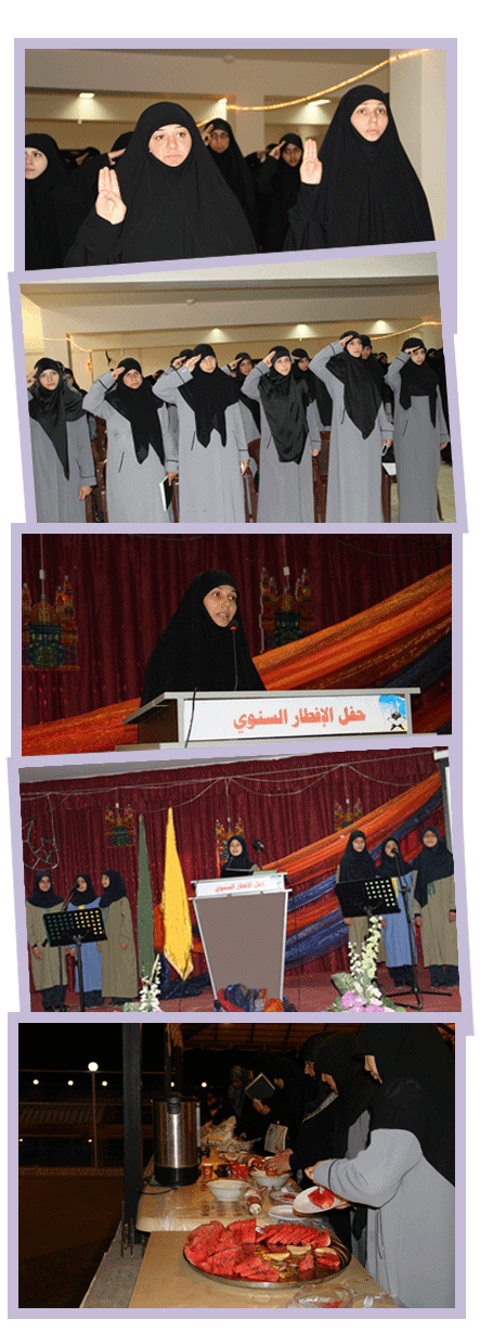 حفل الإفطار الرمضاني الذي أقيم على مسبح المدينة كان قد سبقه برنامج تخلله كلمة للقائدة زينب غندور شرحت فيها خطبة الرسول الأكرم(صلى الله عليه وآله) في استقبال الشهر الفضيل،وركّزت على مراقبة السلوك واستدراك الخطأ والعمل على طاعة الله،وأكّدت على الإستفادة من حصة شهر رمضان للعناصر وتوجيههن إلى فعل الخير وخدمة الناس..