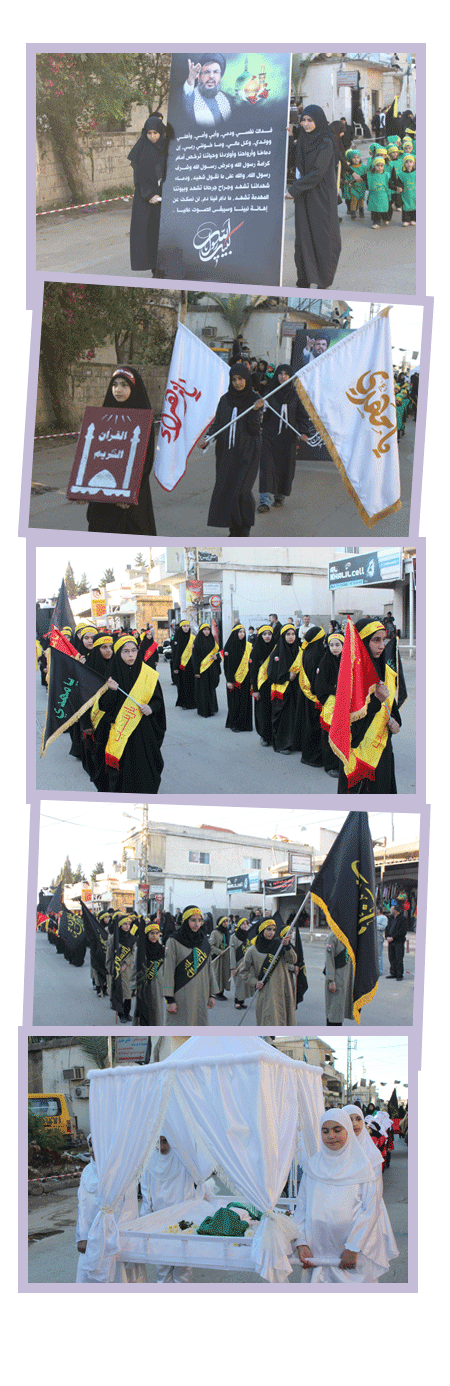 بألوان عاشوراء البطولة رسمت المرشدات في فوج السيدة مريم (عليها السلام) - أنصار في منطقة جبل عامل الثانية المسيرة العاشورائية التي خرجن بها نصرة لشهيد كربلاء وأهل بيته (عليهم السلام). المسيرة التي جابت الشوارع الرئيسية في بلدة أنصار تميز فيها حضور الأهالي الكثيف على جوانب الطرقات، وسار في مقدمتها دليلات حملة الرايات الحسينية والشعار العاشورائي الإعلامي للعام (لبيك يا رسول الله)، تبعتها فرق المرشدات اللواتي لبسن الأكفان الحسينية والعصبات وحملن الرايات بألوانها العاشورائية، وسار موكب في المسيرة حمل اسم الطفل الرضيع تقدمه مجسم مثل المهد حملته فرقة ارتدت لباسًا ملائكيًا سار خلفها الأطفال بأكفانهن الخضراء. المسيرة علت فيها قبضات الزينبيات التي ترافقت مع هتافاتهنّ (لبيك يا حسين).