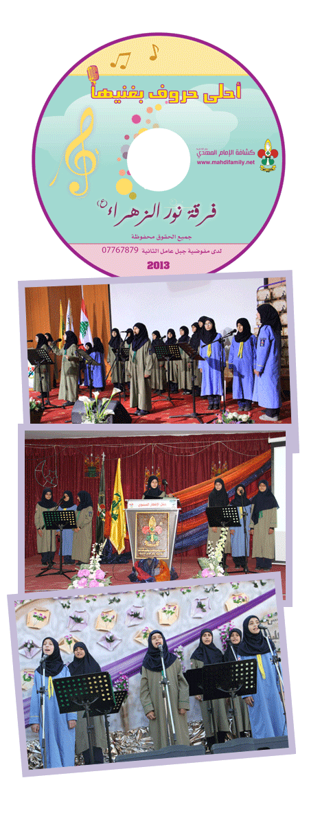 في السنة الأولى على تأسيسها ،تُطل فرقة نور الزهراء (عليها السلام) الإنشادية التابعة لمفوضية جبل عامل الثانية بإصدارها الجديد (أحلى حروف بغنيها) والذي سيصدر قريباً ،ويتضمن الإصدار 11 نشيد من أناشيد الفرقة ،وحملت الأناشيد العديد من العناوين "ساعدينا يا طيور"، "بيت الله الحرام"،"أحلى حروف بغنيها "وهو اسم ال cd وهي أنشودة لصاحب الزمان (عجّل الله فرجه)،الأناشيد كلماتاً وألحاناً وإنشاداً هي من إنتاج الفرقة وحق حصري لمفوضية جبل عامل الثانية وبالتعاون مع كشافة الإمام المهدي (عجّل الله فرجه).