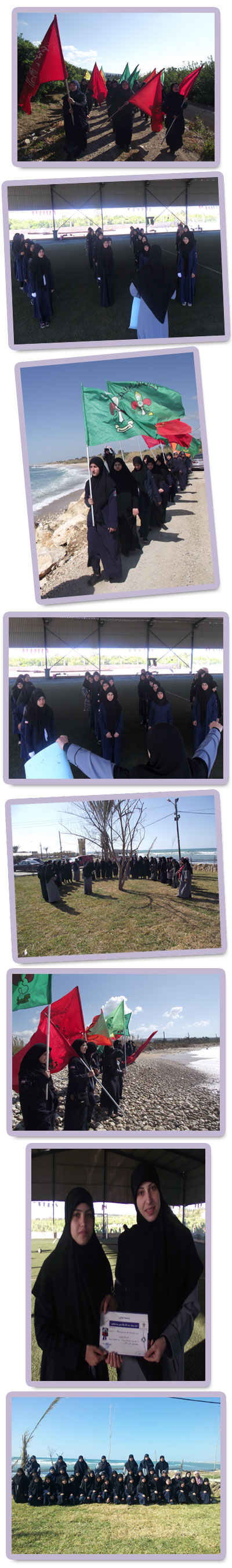 عهدا لك سيّدتي... نبايعك مولاتي... بنور هديك نهتدي... قسما...قسما...قسما...قسم عاهدت به 45 دليلة من قطاع الساحل أنسيّة البتول _زينب الحوراء عليها السلام في يوم ولادتها ضمن نشاط أقامه القطاع بالتعاون مع كشّافة الإمام المهدي عجلّ الله تعالى فرجه الشريف تكريما للدليلات في يومهنّ...افتتح النشاط بكتابة رسالة شوق للإمام الحجة عحلّ الله تعالى فرجه الشّريف والّتي رافقت الدليلات بالمسير إلى شاطىء البحر حيث امتزجت مع زبد البحر لتصل بلهفة وشوق إلى صاحب العصر والزمان عجلّ الله فرجه...وعلى مائدة السّيدة زينب عليها السلام ااجتمعن...ونداء بالقطار انتظم ابتدأ مراسم التقاليد الكشفيّة عبر نداء الصافرات ورحلة الإستكشاف ،ليختتم النشاط بتوزيع أوسمة الهوايات للمستحقات لها.