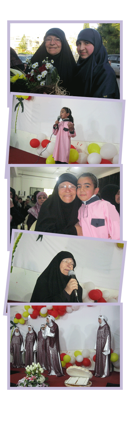 بحضور أجمل الأمهات الحاجة أم عماد مغنية افتتح فوج الشهيدة أم ياسر/عبا في منطقة جبل عامل الثانية حفله الذي اقامه في اجواء عيد الأم وولادة السيدة زينب(عليها السلام)،الحفل افتتح بمراسم تعظيم للقرآن الكريم قدّمها الفريق القرآني في الفوج وقصيدة شعرية عن الأم،تلاها كلمة للحاجة أم عماد تحدثت فيها عن تضحيات الأم تجاه أبنائها،قبل أن يقوم الفوج بتكريمها على كل التضحيات وتكريم كل الأمهات بتوزيع هدايا رمزية بالمناسبة.