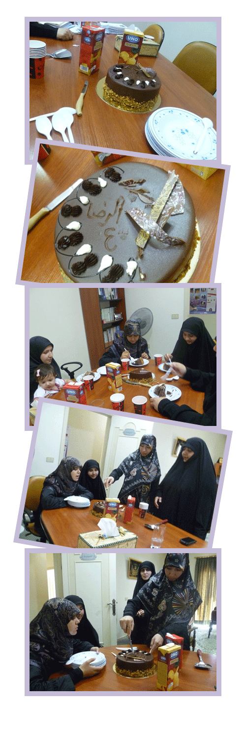 احتفت مفوضية مرشدات جبل عامل الثانية بولادة غريب طوس الإمام علي بن موسى الرضا(عليه السلام) بحفل أقيم بالمناسبة جمع أخوات المفوضية جرى خلاله تقطيع لقالب حلوى حمل اسم ( الرضا عليه السلام) ، فمبارك للجميع هذه الولادة الميمونة وكل عام وانتن بخير.