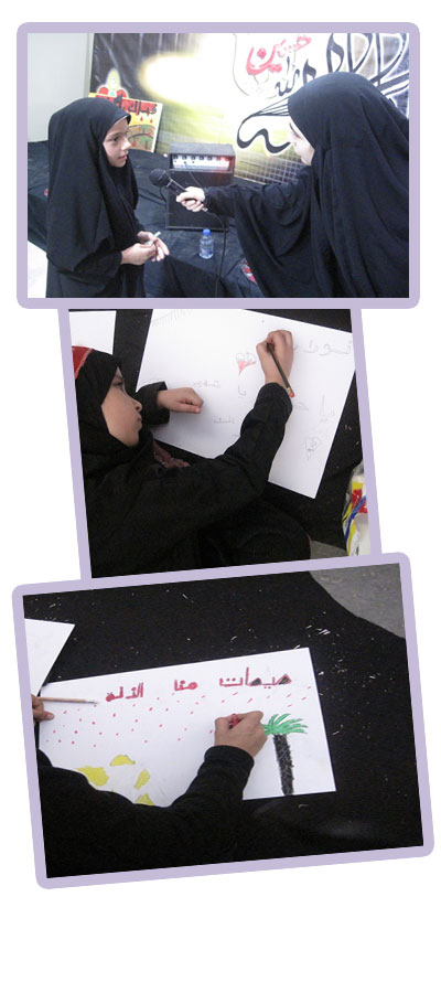 لبوا نداء سيدهم حين استنصرهم واعلنوا له الولاء والتضحية، ووفوا بعهدهم بالدم ، هم اصحاب أبي عبدالله الحسين عليه السلام، منهم تعلمنا معنى الوفاء والتضحية، فسرد قصصهم فوج السّيدة الزهراء عليها السلام _الطيبة في قطاع الحجير، لتروي بعدها قائدة السيرة الحسينيّة بأسلوب يتناسب وأعمار الناشئة، فتنوعت الفقرات من مسابقة ثقافية ولطمية حسينية ، لتعبّر بعدها الفتيات عن حبهن للإمام الحسين وأهل بيته عليهم السلام من خلال المرسم العاشورائي .