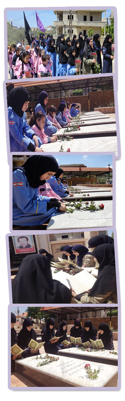زار فوج السيدة أم البنين (عليها السلام)/ برج الشمالي في قطاع قانا في مفوضيّة جبل عامل الأولى أضرحة شهداء قانا , حيث نثرن وروداً حمراء تنبعث منها رائحة النصر على الأضرحة من كافة المرشدات لا سيما قراءة آيات بينات من القرآن الكريم.