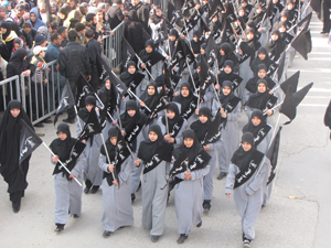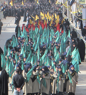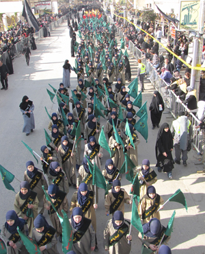 انّهنّ العابرات نحو الحسين، على صهوة الجراح، أسرجن دماءهن للقاء، زرعن أجسادهنّ زهراً وولاءاً... هنّ عاشقات للحسين وزينب، هنّ فاطميّات مرشدات المهدي(عج) وكشافة الإمام المهدي(عج)...أتين من كلّ حدبٍ وصوب، ملأن طرقات مدينة بعلبك، وانطلقن في موكب الأحزان احياءاً لأربعين الإمام الحسين (ع) من أمام مقام السيّدة خولة (ع) وصولاً الى مسجد رأس الحسين (ع)، لينتهي بهنّ المطاف على مرجة رأس العين، مسرحيّة، لطميّة، ومجلس عزاء حسينيّ، هكذا وبلباسهنّ الموحّد، توشّحن بوشاح "لبيك يا حسين" التي تخفق بها القلوب وترددها الحناجر، فكانت الأصوات تصدح بها،والقبضات تعلو معانقة راياتٍ جدّدت البيعة والولاء بألوانها التي حاكت المصيبة...