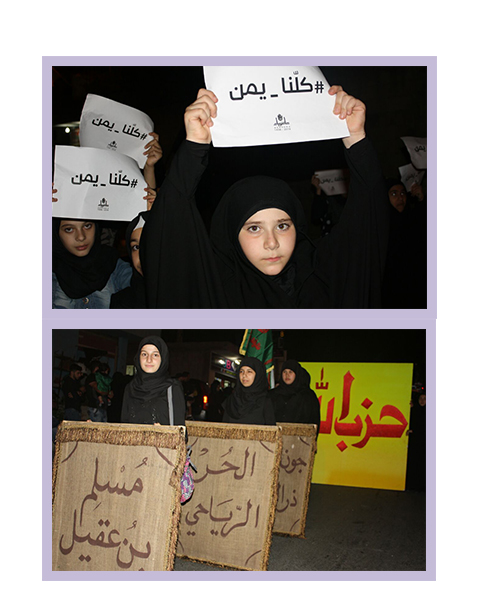 شاركت المرشدات الكشفيات في فوج السيدة الزهراء (عليها السلام) /حاروف مفوضية جبل عامل الثانية بمسيرة نصرة في يومها السابع من الاحياءات العاشورائية، ومواساة لاهل اليمن رفعت المشاركات شعار "كلنا لليمن" .