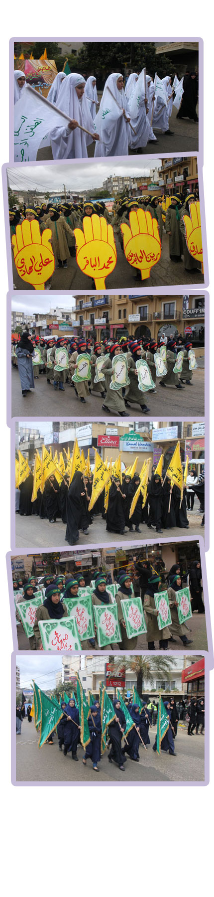 تحت المطر... شاركت 300 مرشدة من جمعية مرشدات المهدي (عجل الله فرجه) في جبل عامل الثانية في المسيرة المهيبة التي أقامتها جمعية كشافة الإمام المهدي (عجل اله فرجه) في مدينة النبطية إحياءاً ل13 محرم، والتي اخترقت شوارع المدينة فداءً لأبي عبد الله الحسين (عليه السلام) ولموكب السبي الذي حصل بعد استشهاده..