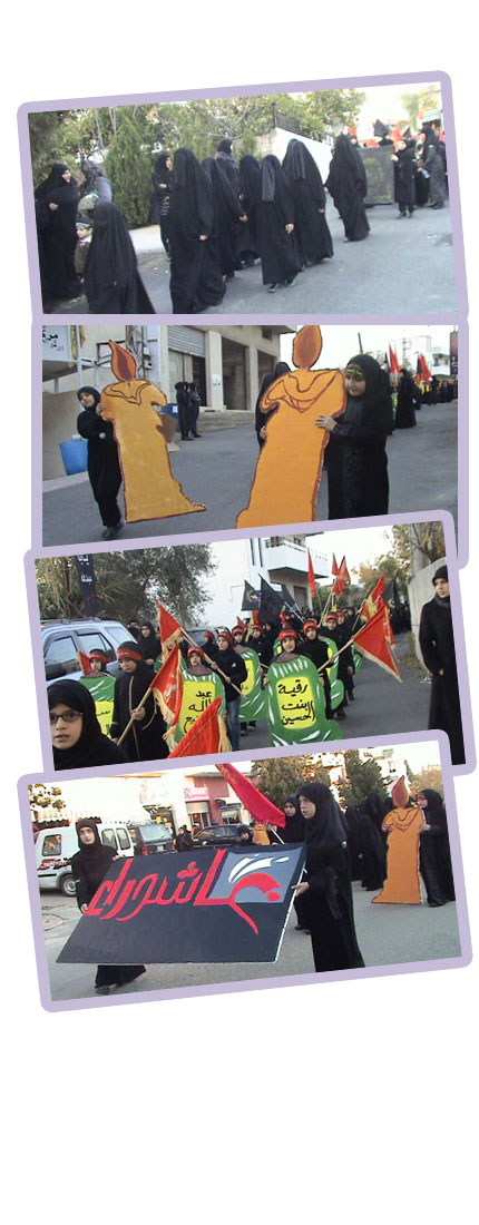 المسيرة التي علت فيها القبضات الزينبية تقدمها الشعار الإعلامي العاشورائي لهذا العام والذي صُنع من الفلين،و كذا بقية المجسمات العاشورائية التي حملتها وسارت بها الفتيات في فرق متعددة،كما وسارت فرق حملت الرايات الحسينية، وفرقة مثّلت السبايا كانت ختام المسيرة..