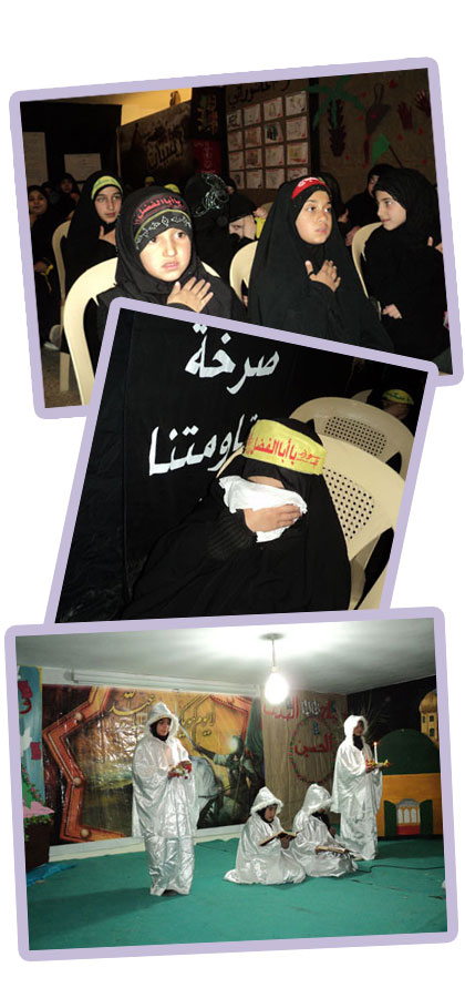 المراسم القرآنية و التي اتخذت الطابع العاشورائي تُقَدَم في كل يوم عبر فكرةٍ جديدة توصل المفاهيم القرآنية تارة و المفاهيم العاشورائية أحياناً،و يتخلل الإحياء أيضاً مجلس حسيني يتخلله تمثيل للواقعة مباشرة أمام أعين الفتيات مما يؤدي إلى ترسيخ الفكرة أكثر عبر الصوت و الصورة معاً..