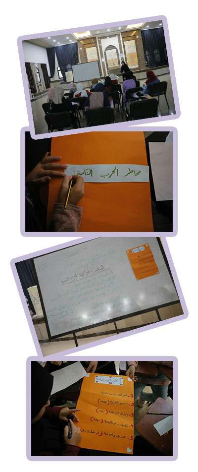 افتتحت الورشة بقرآن كريم وقامت القائدة بعملية عصف افكار …وتضمنت الورشة تقسيم مجموعات وتوزيع افكار وساد النشاط جو من المنافسة ..واختتم النشاط بصرخات ودعاء الحجة