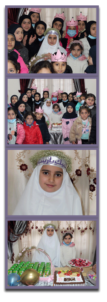 ميلاد الطهر والعفاف زينب، فخر المخدرات، وبهذه المناسبة المباركة اجتمعت براعم وزهرات فوج السيدة خديجة/ رياق في القطاع الشرقي للاحتفال على طريقتهن الخاصة فكانت البداية مع آيات بينات ثم تلتها ورشة كوني كزينب ليختتم الاحتفال بتكليف زهرة بلغت سن التكليف وبعض التواشيح وتناول الحلوى ابتهاجا بالمناسبة العظيمة