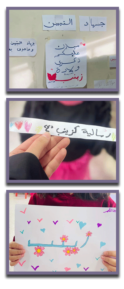 في أجواء ولادة السيدة زينب نظم فوج السيدة زينب عليها السلام – دورس يوم خاص لمرشدات الفوج لاحياء المناسبة فكانت الألعاب الترفيهية الهادفة والمليئة بالمعلومات حول السيدة زينب عليها السلام كما وتخلل النشاط فقرة تعبير حر فرسمت المرشدات لوحات عبرن خلالها عن حبهن لمولاتهن الحوراء عليها السلام