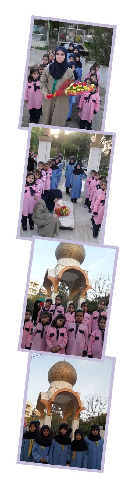 روضة شهداء البلدة كانت على موعد مع المرشدات اللواتي حضرن براعم وزهرات ومرشدات يحملن إكليل من الورود حمل اسم الفوج وضعنه على ضريح شيخ الشهداء مترافقا مع تمتمات الأطفال بقراءة سورة الفاتحة..