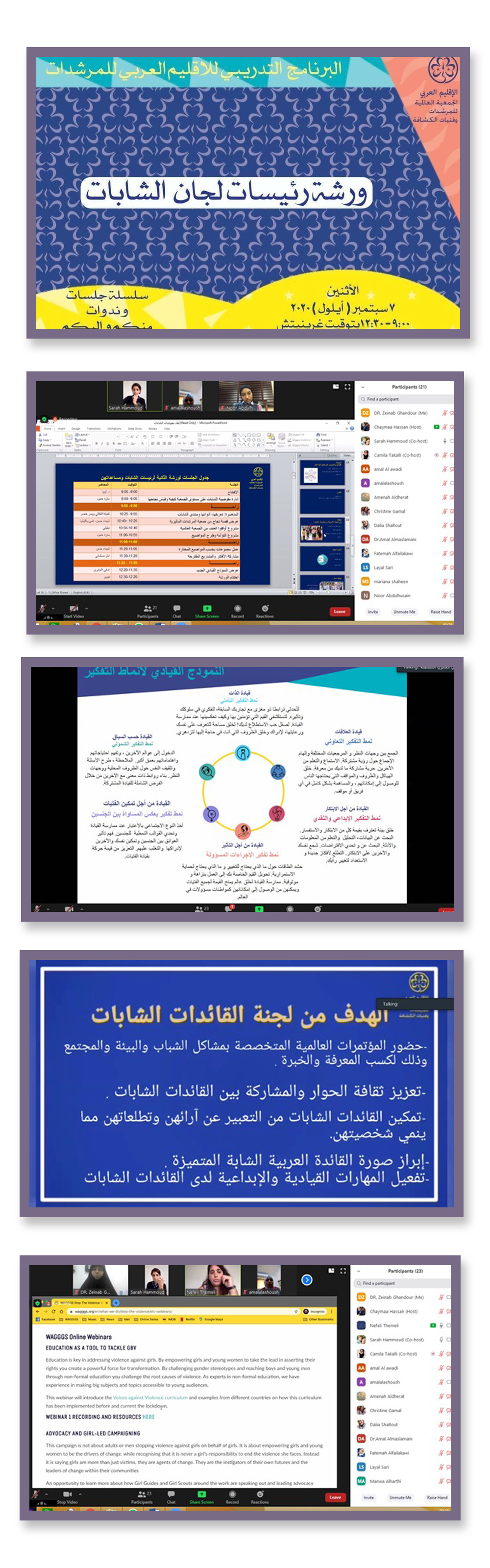 شاركت رئيسة جمعية مرشدات المهدي الدكتورة زينب غندور ممثلة الاتحاد اللبناني للمرشدات والدليلات، في الورشة الثانية لرئيسات لجان الشابات ومساعداتهن التي نفّذتها اللجنة العربية للمرشدات، بداية رحّبت رئيسة الإقليم العربي للمرشدات بالحاضرات والتي بلغ عددهن ٢٧ مشاركة وضيفة وقيّمة على الورشة.