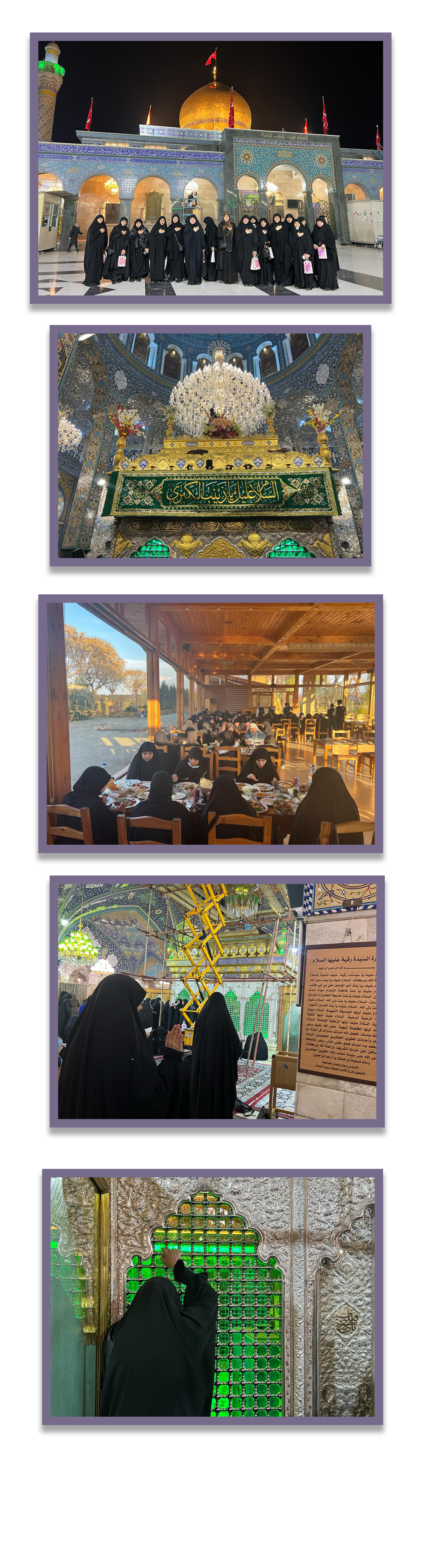 كرّمت جمعية مرشدات المهدي مفوّضاتها وقائداتها الساهرات على بناء جيل فتياتنا البناء السليم والمفيد للمجتمع، حيث كان التكريم وجهته مقام السيّدة زينب عليها السلام، والسيدة رقية عليها السلام. وكان للوفد وقفة جميلة مع فريق من خادمات السيدة زينب عليها حيث استقبلت القائدات والمفوضات بالورود.