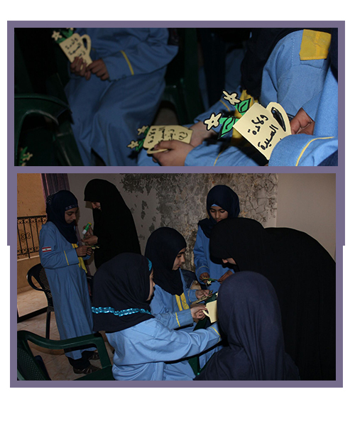 شاركت باقة الزهرات في فوج الشهيدة بنت الهدى(رضوان الله عليها)/الزرارية في مفوضية جبل عامل الثانية بنشاط فني أقيم لهن بأجواء الولادة المباركة للحوراء زينب (عليها السلام) تخلله صنع بطاقة معايدة وبعض الفقرات من وحي الأجواء.