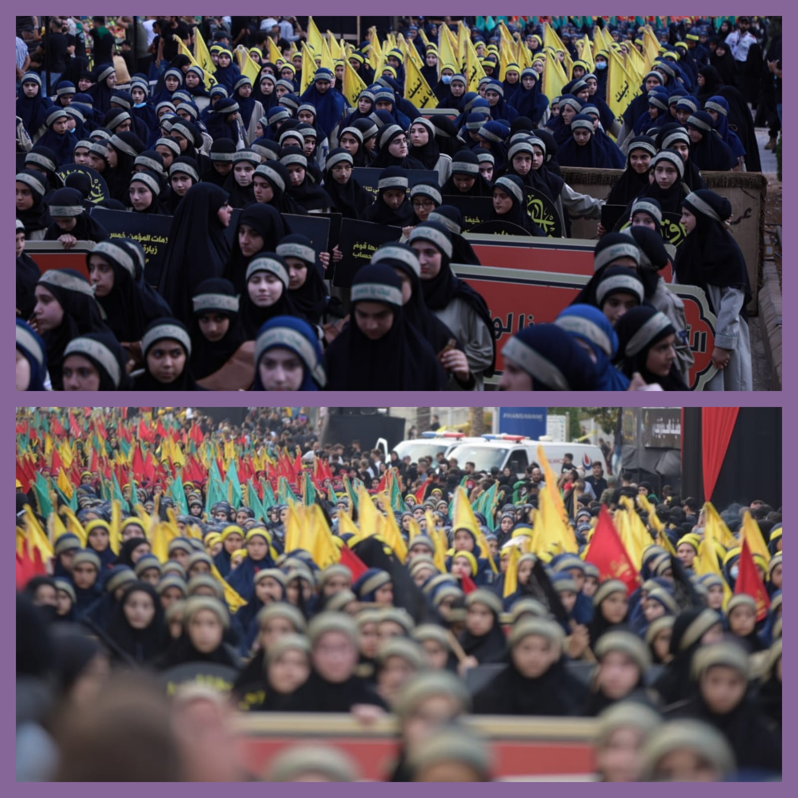 الزينبيات حملن الرايات والفنيّات العاشورائية وسرن في موكب الإباء على وقع النداءات والتلبية للإمام الحسين واهل بيته عليهم السلام.