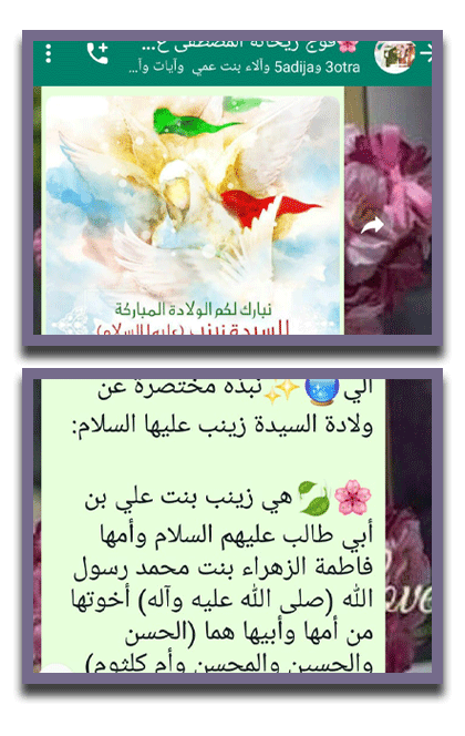 بمناسبة ولادة السيدة زينب عليها السلام، أقام فوج ريحانة المصطقى/ بديتا ضمن جلسته الأسبوعية فقرات عديدة الكترونية تعرفت خلالها المرشدات على السيدة الجليلة ونبذة مختصرة عن حياتها وفي النهاية ارسلت القائدات بطاقات معايدة عبر الوتساب للمرشدات والأهالي